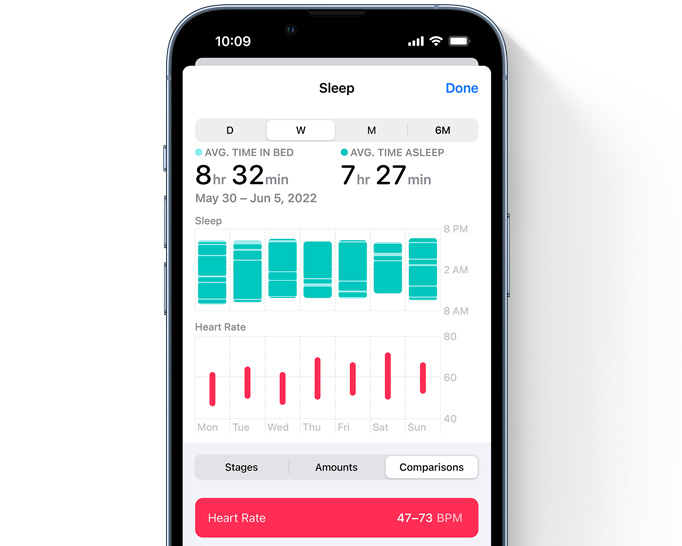 Une autre fonctionnalité plus familière est aussi améliorée : le suivi de sommeil. Avec la nouvelle version de watchOS, vous pourrez visualiser vos périodes de sommeil paradoxal, lent et profond, ainsi que vos moments d’éveil. Sur iPhone, la toute nouvelle application Santé permet de de consulter des données telles que le rythme cardiaque et la fréquence respiratoire sous forme de graphiques.