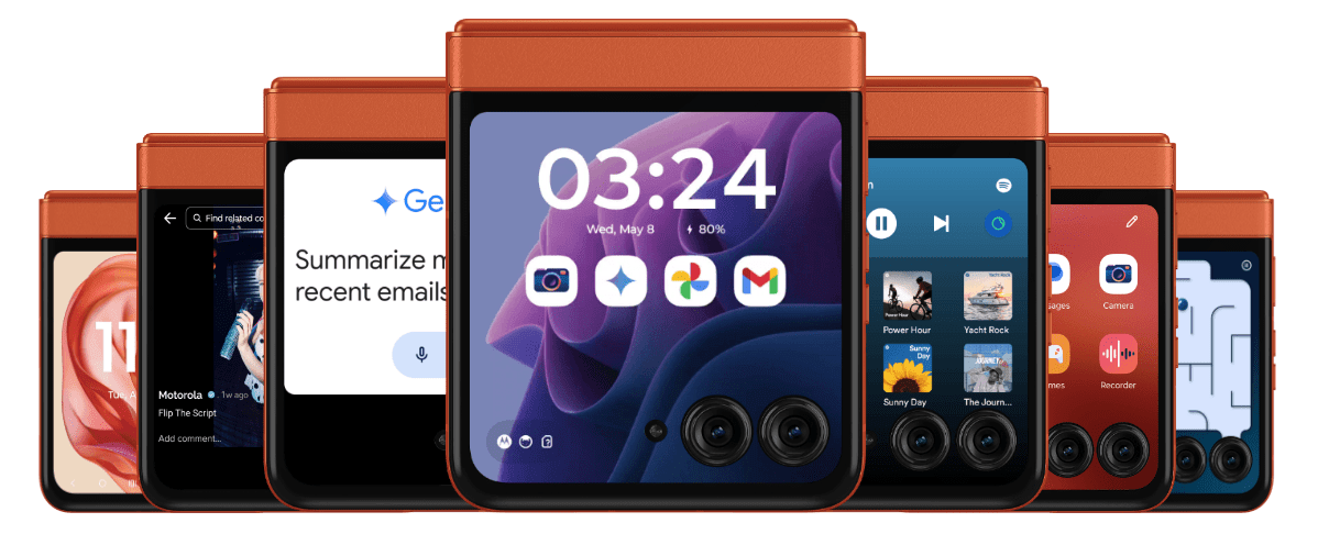 Les deux modèles bénéficient d’une charnière améliorée, plus fine et durable, certifiée pour 600 000 ouvertures/fermetures. Ils tournent sous Android 14 avec l’interface Hello UI de Motorola. Tout comme Samsung avec Galaxy AI, des fonctionnalités d’IA sont intégrées avec Moto AI. De plus, l’application Google Gemini est livrée avec les deux téléphones.