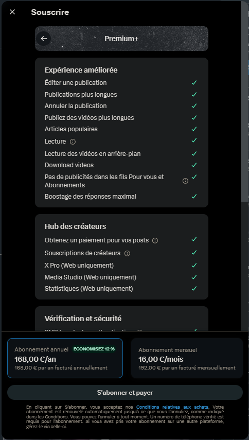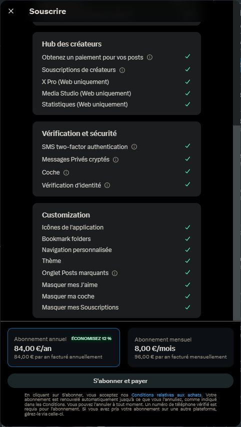 Actuellement, il est possible de souscrire à un abonnement Premium sur X, facturé à 8€/mois (ou 84€/an). En plus du badge bleu de certification, il propose des fonctionnalités visant à améliorer l’expérience, telles que :