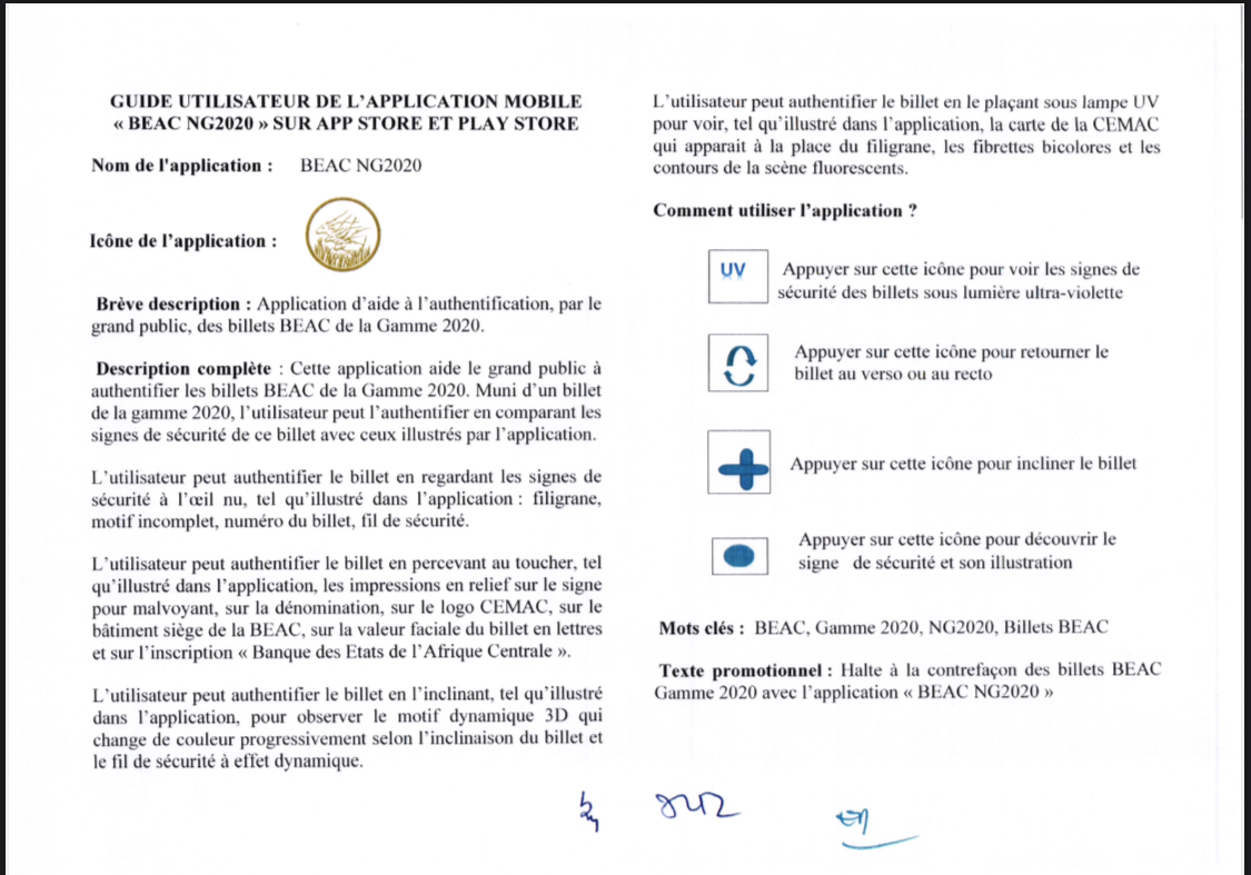 Dans un contexte de prolifération des faux billets et de fragilisation de la confiance du public, la BEAC introduit BEAC NG2020. Disponible gratuitement sur l’App Store (via ce lien) et Google Play (via ce lien), cet outil s’adresse aussi bien aux particuliers qu’aux commerçants et professionnels du secteur financier. Il permet de vérifier en temps réel l’authenticité des coupures.