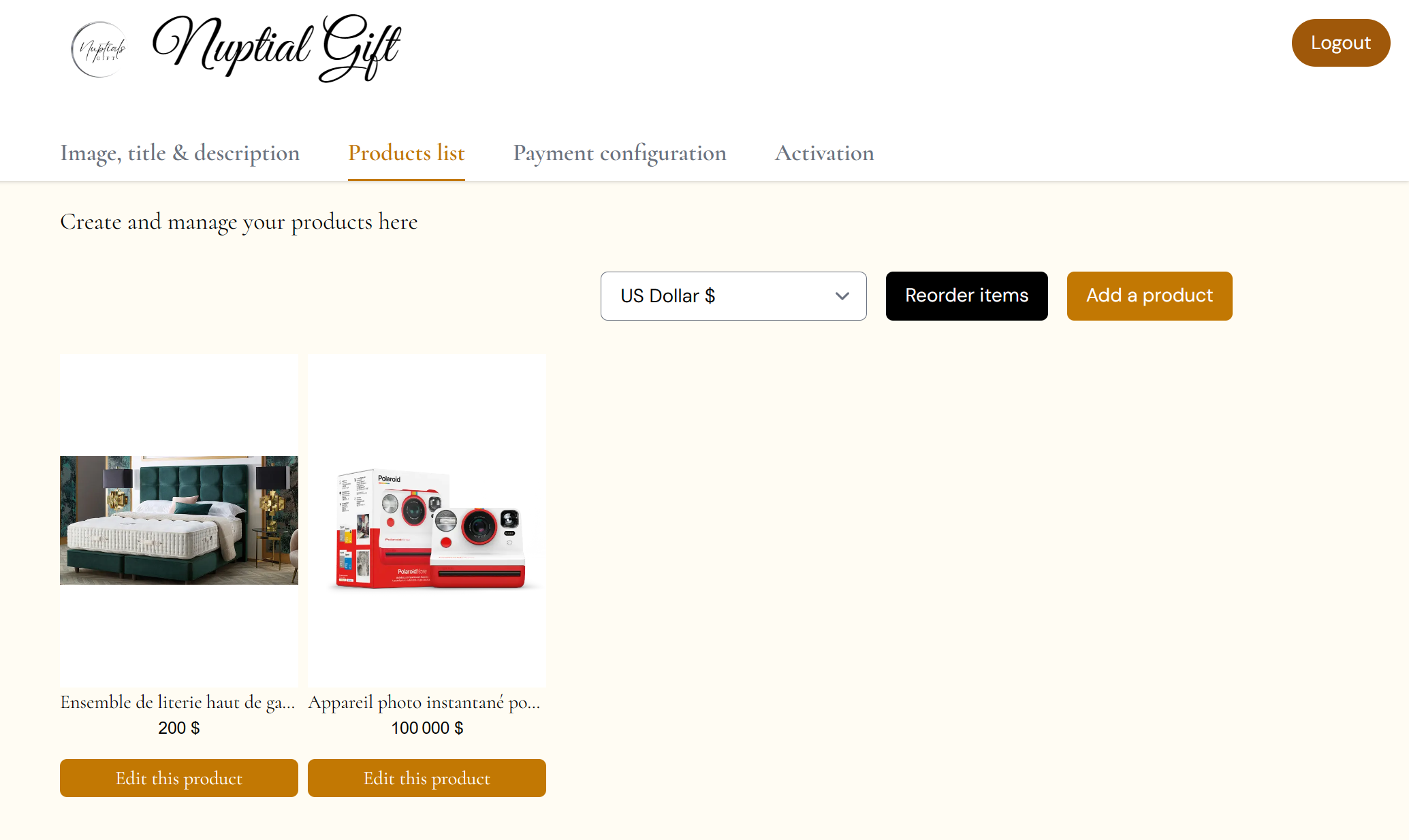 Sur cette page, trois devises sont disponibles : Dollars US, Euro et FCFA 🥳. Cependant, faites attention au choix de la devise, car il est unique pour tous les cadeaux présents. Si vous changez la devise, elle changera pour tous les cadeaux, sans conversion.
