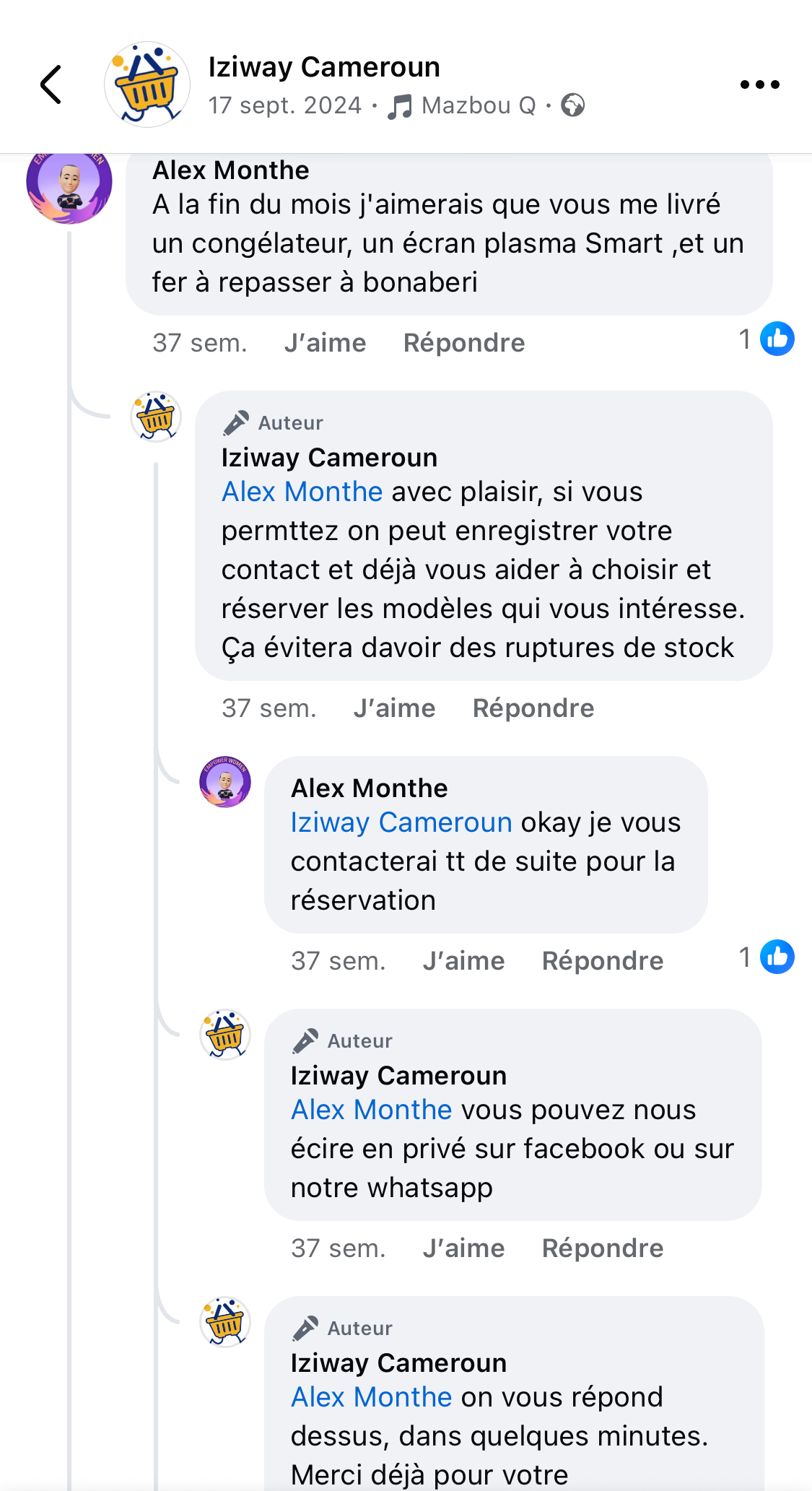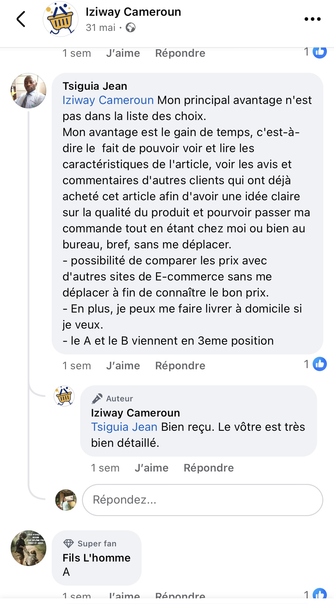 Sur la page Facebook d’Iziway Cameroun, les retours sont nombreux. Certains saluent la rapidité de la livraison et la qualité des produits. D’autres partagent leurs bonnes affaires ou remercient le service client pour sa disponibilité.
